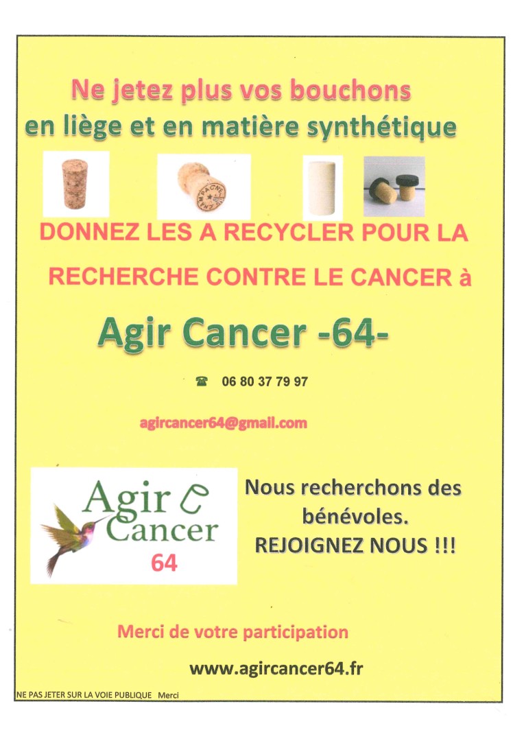 - L’association Agir Cancer collecte des bouchons en liège ou synthétique auprès de tous les publics.
