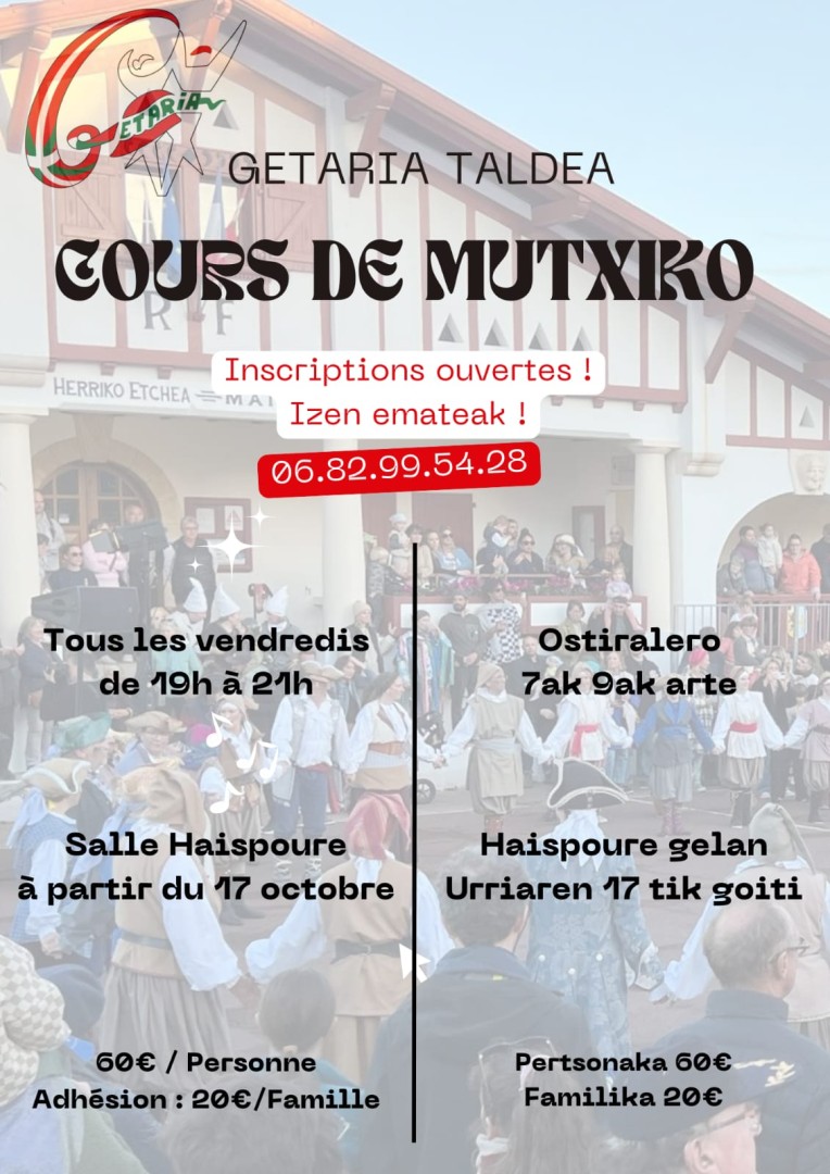 Getaria taldea vous propose donc des cours de mutxiko adultes, tous les vendredi de 19h à 21h, salle Haispoure, à partir du 17 octobre durant l’année scolaire.