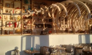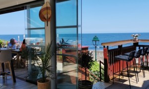 Un comptoir face à l’océan dans une ambiance marine hétéroclite.