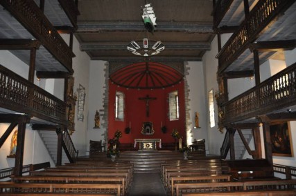 L’église a été élargie et rehaussée en 1859 puis rénovée en 1970 : la décoration allégée met mieux en valeur les retables et les statues datant du XVIIème siècle, le décor peint des poutres de la charpente, les sculptures des balustrades des galeries et les poteaux de soutien en Y, chacun étant taillé dans le même chêne.